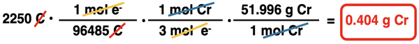 1. A 1.25-A current is used to produce chromium metal from a solution containing Cr3+ ions. What mass of chromium is produced in 30.0 minutes?