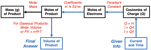 We subsequently used stoichiometry as a tool to answer How much? questions pertaining to gas stoichiometry (volumes), thermal stoichiometry (kJ of heat), solution stoichiometry (volumes and molarities), and acid-base stoichiometry (volumes and molarities). On this page, we will use stoichiometry as a tool to answer How much? questions related to current, time, and the amount of product (in grams or moles) formed in an electrolysis reaction.