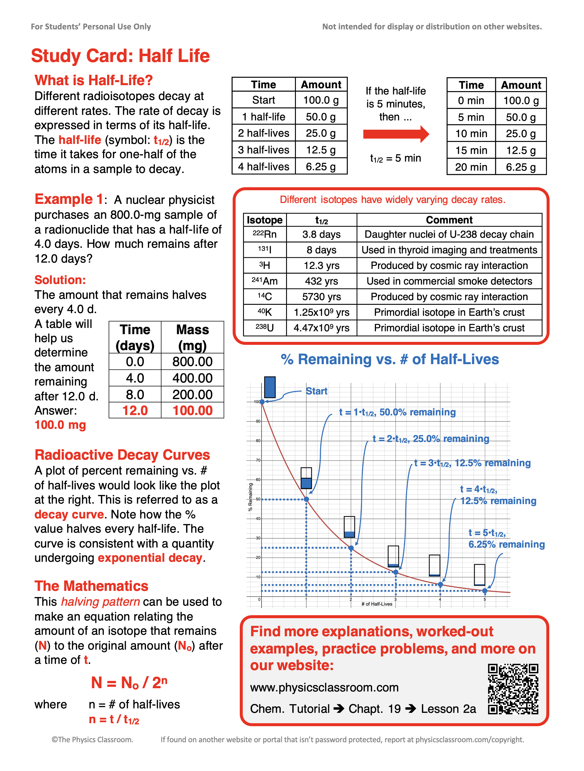 Both problem types can be answered using a table like the one above. The first column is the time - either in a unit such as years or expressed in terms of half-lives. From row-to-row, the value increases by one half-life (usually a time stated in the problem). The second column refers to the amount remaining. It could be the percent that remains, the fraction that remains, or a mass in grams (or comparable unit). From row-to-row, the value is changed to an amount that is one-half the previous row.