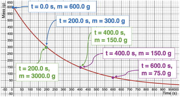 Three “trials” are performed. Each trial involves reading values from the graph to determine the time elapsed between two points that have mass values with ratios of 1:2. The selected points are shown on the graph below. The work is shown below the graph: