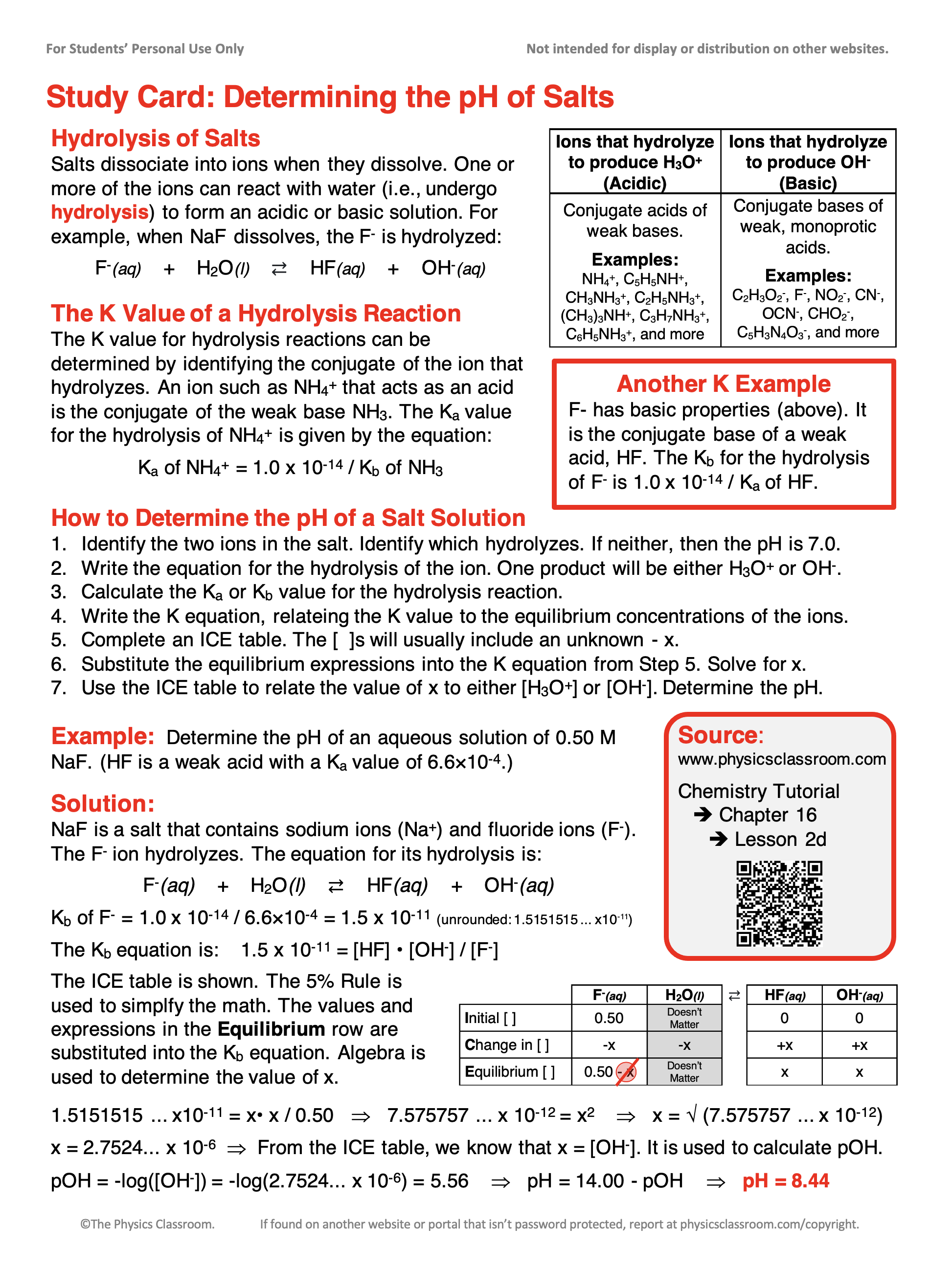 The hydrolysis of salts was discussed in great detail in Chapter 15 of our Chemistry Tutorial. On this page, we will take that discussion further by discussing how to determine the pH of a solution containing a salt that undergoes hydrolysis. We assume an understanding of hydrolysis in our discussion. Those who need to establish a sturdy background understanding of the topic should visit our page titled Predicting and Explaining the Acidity Level of Salts.