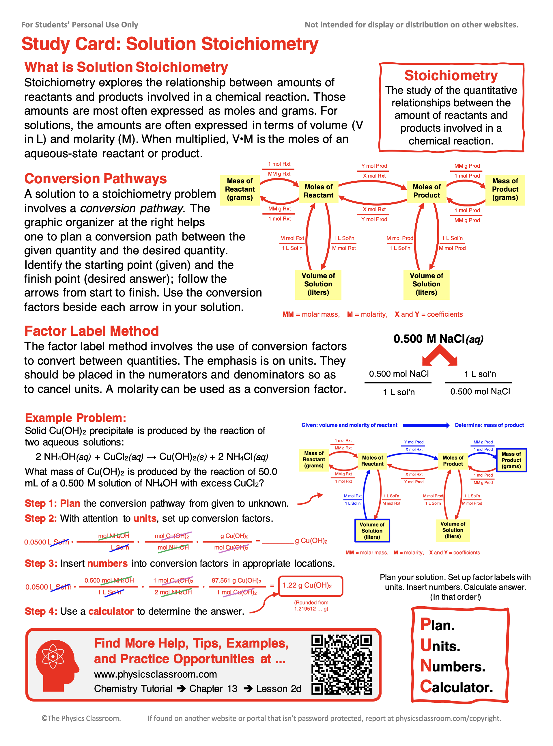 - Download our Study Card on Solution Stoichiometry. Save it to a safe location and use it as a review tool.