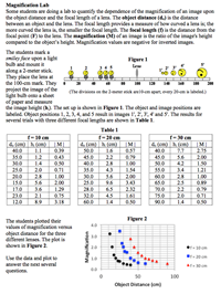This passage describes a student experiment investigating the effect of the object distance from a lens upon the characteristics of the image that is formed by the lens. Data is presented in the form of a diagram, three tables and a graph. Questions target a student's ability to determine the effect of one variable upon another variable, to select information from a table or graph, to interpret a complex diagram, to draw conclusions that are consistent with two or more data presentations, to interpolate and extrapolate from a table or a graph, and to make predictions based upon a model.