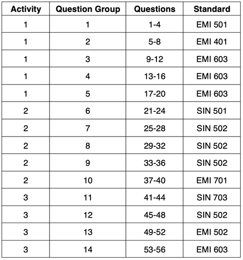 While the Sticky Tape Experiments activity addresses the three NextGen Science and Engineering Practices above, the activity drew its greatest inspiration from ACT's College Readiness Standards for Science Reasoning. The activity consists of 56 questions organized into 14 Question Groups that are spread across the three activities. Two strands (Science Investigation - SIN; and Evaluation of Models, Inferences, and Experimental Results - EMI) of the College Readiness Standards are addressed in this activity. The code given for the standard includes three letters to indicate the strand and three numbers to indicate the specific standard within that strand. Higher numbers are indicative of more complex science reasoning skills. The relationship between the questions and the standards is as follows:
